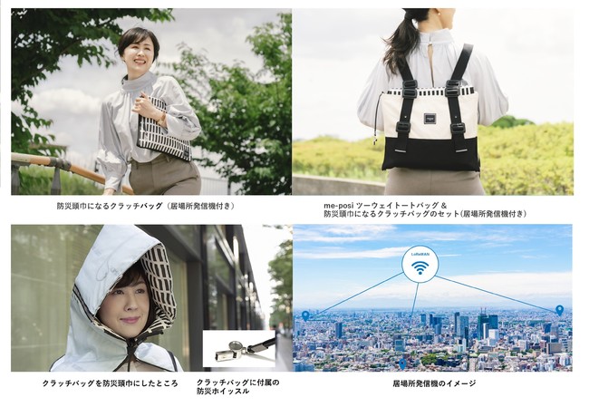 2021年6月22日 / 最終更新日時 : 2025年6月25日 ニュースリリース 災害時居場所発信機を搭載した、防災頭巾になるクラッチバッグを新発売 居場所発信機を搭載した、防災頭巾になるクラッチバッグを2021年6月22日より、販売サイト” me-posi (https://me-posi.com/ )“にて販売を開始します。「防災頭巾になるクラッチバッグ(居場所発信機付き)」は、安心を持ち歩くをコンセプトに開発した商品で、もしもの災害時に安心を確保できる機能を数多く搭載しています。 主な安⼼機能 おしゃれなクラッチバッグが3ステップで防災頭巾になります防犯や災害時に居場所を知らせる防災ホイッスル付きです避難所や野外でクッションとして使用できます水難事故時には、エアクッションをふくらませて簡易浮袋として使用できます災害時、居場所発信機付きで位置情報をしっかりと届けられます 「防災頭巾になるクラッチバッグ(居場所発信機付き)」は、いつどこで起こるかわからない災害に備えて、いつでも持ち歩けていざという時に使える、ファッション性と防災グッズとしての利便性を兼ね備えたクラッチバッグです。またクラッチバッグの防災頭巾時の表面は、難燃で破れにくく頭を守る生地としてエアバッグを再利用。環境にも配慮したサスティナブルなバッグです。居場所発信機付きで災害時に自分の居場所情報を継続的に知らせることができます。「防災頭巾になるクラッチバッグ(居場所発信機付き)」を収納して持ち歩きに便利な、リュックにもなるトートバッグとのセット商品もご用意いたしました。 商品情報および仕様 商品名:防災頭巾になるクラッチバッグ(居場所発信機付き) 商品コード:MP02-002-s1JANコード:4573476560140価格: 36,600円(税込)発売日:2021年6月22日サイズ:横320mm、高さ270mm(防災頭巾時1030mm)、幅25mm重さ:クラッチバッグ:約450g(居場所発信機含まず)居場所発信機の仕様重さ:約108g通信方式:GPS(Global Positioning System)、LoRaWAN(長距離広域ネットワーク) →クラッチバッグ単体(右) →クラッチバッグを防災頭巾に展開した状態(左) 商品名:me-posi ツーウェイトートバッグ & 防災頭巾になるクラッチバッグのセット (居場所発信機付き) 商品コード:MP02-001-s1JANコード:4573476560133価格: 42,600円(税込)発売日:2021年6月22日ツーウェイトートバッグの仕様サイズ:横380mm、高さ300mm、幅30mm重さ:約560g
