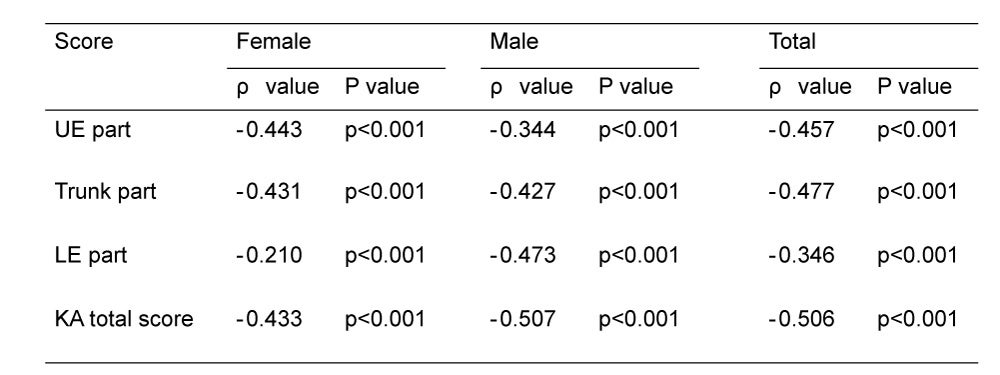 表1:年齢と、KAスコアと各部位のスコアとの関連(UEパートは上半身、LEは下半身パターンを示す)