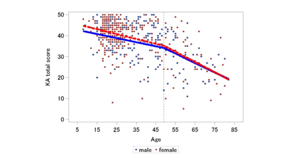 • また、加齢に伴うKAのスコアの低下は49.1歳を境に急激に低下することを突き止めました。