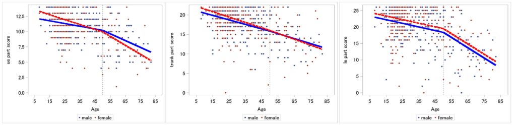 その結果、年齢とKA総スコア、および各パートのスコアの間には負の相関関係を認めました(表1)。加えて、KA総スコアは、49.1歳を境に急激に低下することが明らかとなりました(図1)。また、性別の違いによる各パートのスコアの低下については、女性において上半身のスコアが男性よりも急激に低下することが明らかになりました(図2)。
