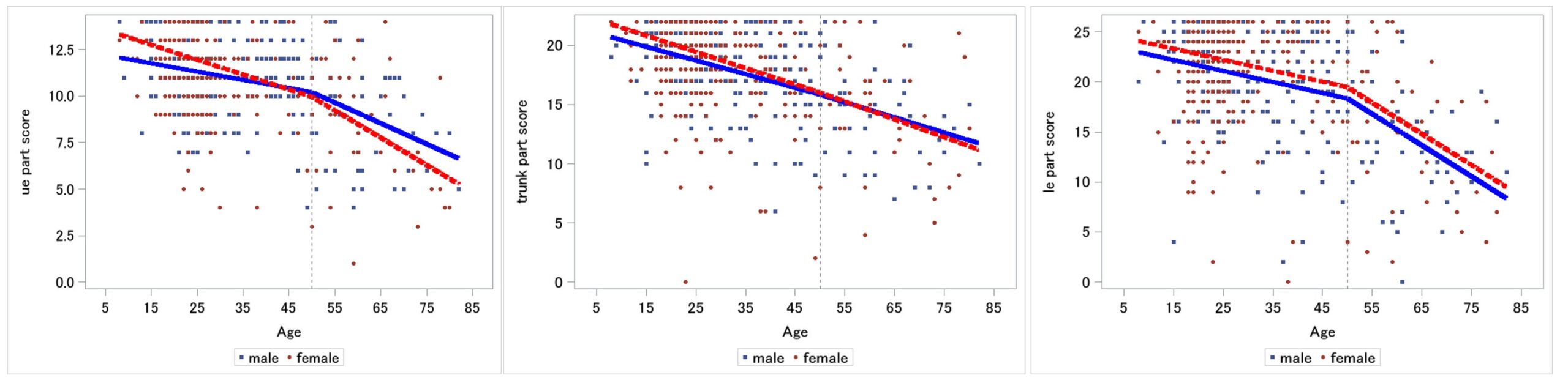 図2:性別ごとの加齢に伴う部位別スコアの低下の違い(左:上半身、中:体幹、右:下半身)