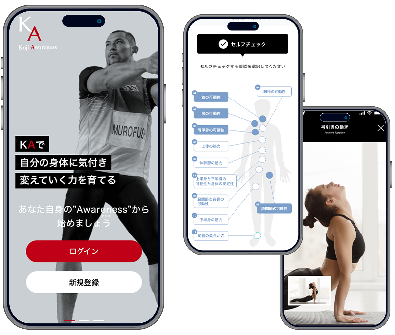 このKoji Awareness™を、特別な場所や運動器具を必要とせず、誰もが自宅や職場など好きな場所で、気軽にセルフチェックや、その人に適した改善エクササイズができるようにしたものが「Koji Awareness™」アプリです。