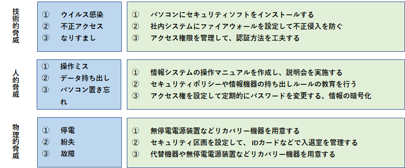 システムで人為的脅威をガードする・アクセス権の設定などのアクセス管理・定期的にパスワードなどを変更・アクセスログを保存し、追跡できるようにする・情報の暗号化・雇用終了後における情報資産の返却、アクセス権の削除