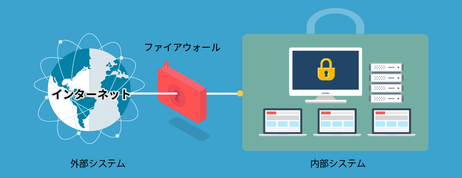 ファイアウォールとは、内部のシステムと外部の中間に位置するセキュリティシステムで、ポートと呼ばれるシステムの入り口を制御することにより侵入しようとするウイルスなどからシステムを守ります。